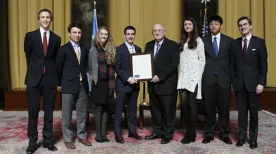 The Edmund J. Sullivan Award recognizes student editors who pursue innovative ways to present the truth on behalf of their audiences. Here, former CSPA Executive Director Edmund J. Sullivan presents the award to awardees in 2014.