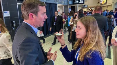 In the concourse of the United Center at the Democratic National Convention in Chicago, student reporter Clare McRoberts interviews Kentucky Governor Andy Beshear on Aug. 21, 2024, about the importance of young people participating in the election and voting. Clare is a senior and an editor-in-chief of the U-High Midway. Photo: Logan Aimone
